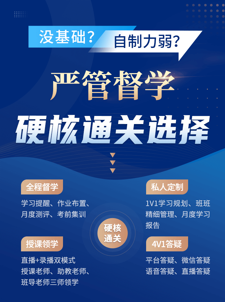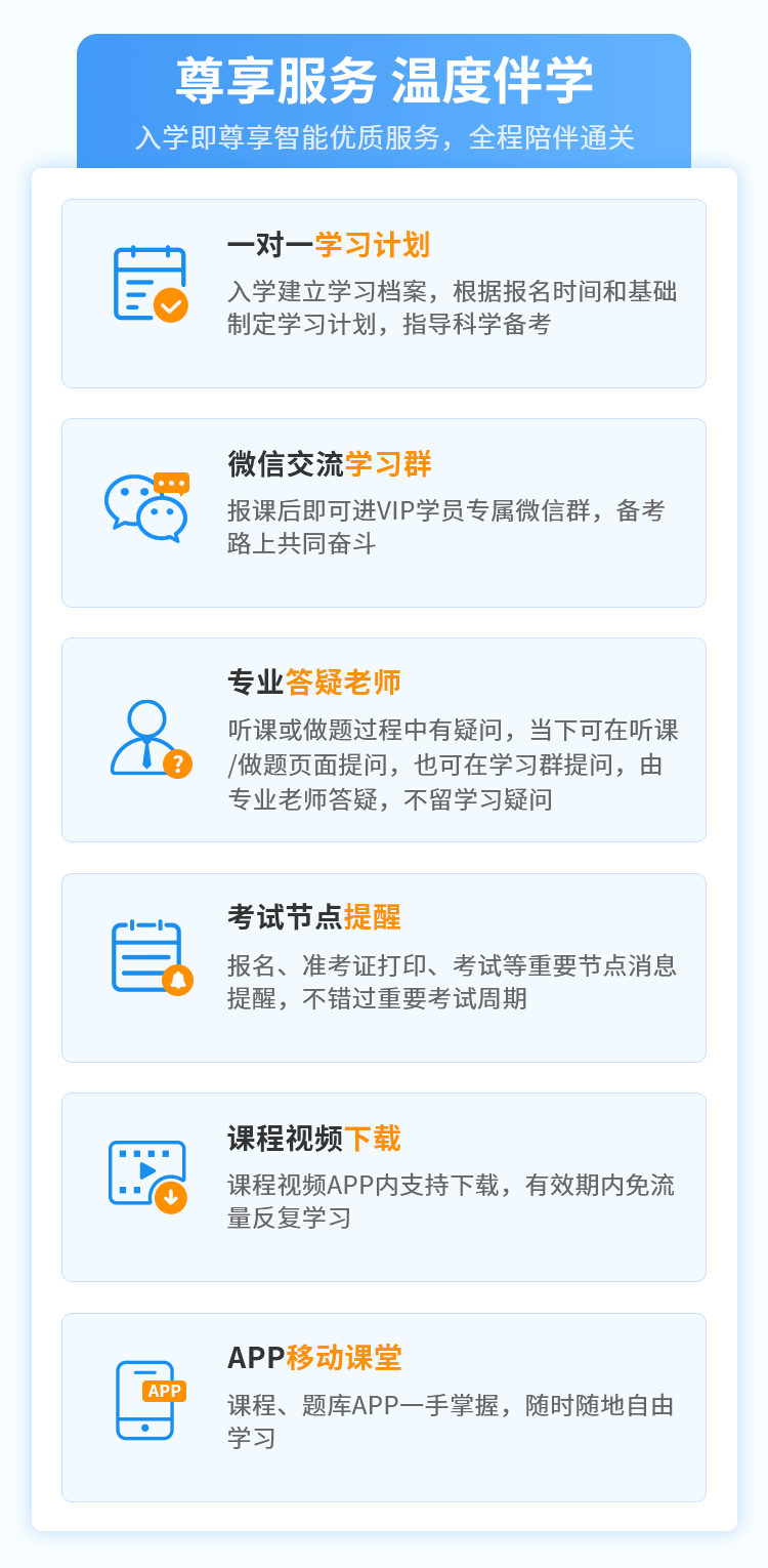 服务保障VIP学员群+移动课堂+老师答疑+课后习题+全程督学+考前冲刺